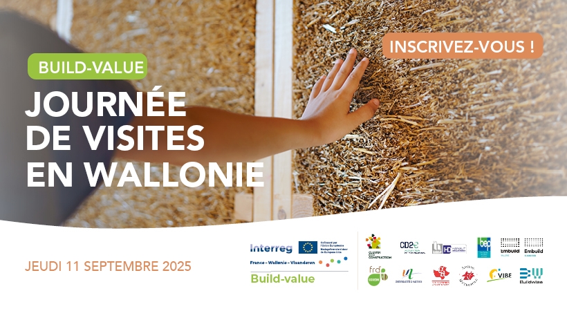 Dans le cadre du projet Interreg Build-value qui a pour but de faire évoluer les méthodes constructives, de faire connaître les éco-matériaux et de démontrer leur fiabilité, nous avons le plaisir de vous inviter à une tournée d’éco-constructions exemplaires en Wallonie, le jeudi 11 septembre 2025.